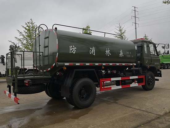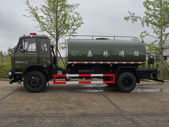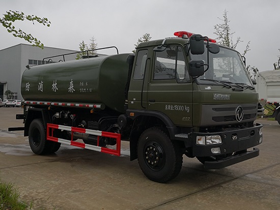 采用東風(fēng)EQ2180GD5DJ型越野汽車底盤,東風(fēng)一排半寬體駕駛室,4×4驅(qū)動(dòng),康明斯ISB190 50國(guó)五發(fā)動(dòng)機(jī),六檔變速箱,東風(fēng)商用車橋,前驅(qū)動(dòng)橋3.8噸,后橋10噸,10.00R20輪胎,軸距4500mm,電動(dòng)玻璃,方向助力,斷氣剎,ABS。罐體采用優(yōu)質(zhì)碳鋼QB235板材,板材厚度4mm,罐體容積11.1立方,變速箱安裝取力器,大功率水泵可泵進(jìn)泵出,后置工作平臺(tái)帶水炮射程25米,消防栓接口左右各一個(gè),選裝駕駛室頂部安裝長(zhǎng)條警燈帶喊話器,全車顏色軍綠,兩側(cè)噴涂白色森林消防字樣。