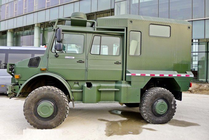 底盤介紹:烏尼莫克U5000擁有兩種軸距分別為3250mm和3850mm,6m的車身長度配合將近2.5m的寬度讓車內(nèi)的空間利用率發(fā)揮到了極致。車頭部分的高度已經(jīng)將近3m,如果加上后加裝的車廂,各位可以想象遇到較低的限高時是多么尷尬。門式車橋在此無需多言,接近500mm的離地間隙,再加上1.2m的涉水深度足以面對所有極限路況,此外選裝軍版套件的涉水深度可以達到1.5m。其零部件及電氣元件有防水保護、再配合防水式前大燈,輪轂、制動器密封等讓這輛猛獸無所不能。除了基本的車身防護裝備,“鵝頸式”縱梁的布置,使梯形車架與兩個相對的縱梁構(gòu)成一個U字型,并焊接在管狀縱梁上,可允許橫縱梁產(chǎn)生較大的扭轉(zhuǎn)度,通過橫向推桿與螺旋彈簧間的聯(lián)動,能實現(xiàn)高達30度的車橋?qū)桥で6c式懸掛也是烏尼莫克實現(xiàn)極端越野的關鍵之一,當車輛需要對角行駛以越過高差超過0.5米的障礙物時,三點式懸掛可以保證車輛形成大角度移動和扭轉(zhuǎn)。相對于粗狂的外形,烏尼莫克式的內(nèi)飾也顯得相當質(zhì)樸,在提倡減少控制面板按鈕的時代,U5000也有著自己的詮釋,那就是將所有舒適裝備盡可能的簡單化,最大化的給輔助駕控的功能按鈕預留空間。UG 100-8型變速器具備8前進擋、6倒擋帶手自一體功能,其前進擋速比為9.57-0.73,倒擋速比為14.56-1.12。兩級常開閥發(fā)動機制動在這種允許載重超過12500kg的龐然大物上相當實用?吹竭@樣的空調(diào)面板,你是否會感覺自己回到了90年代,具備三把鎖的U5000,再配合4.8L直列四缸渦輪增壓中冷直噴柴油發(fā)動機所迸發(fā)出的160kW/2200rpm功率、810Nm/1600rpm扭矩的強大動力數(shù)據(jù),足以保證其優(yōu)異的越野性能,當然你還可以再選裝中央輪胎自動充放氣系統(tǒng)。