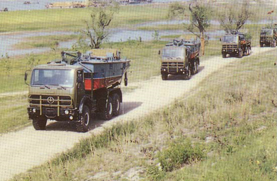 鐵馬XC2200重載卡車(chē)在1980年后期進(jìn)入PLA服役,主要用于運(yùn)輸重型工程設(shè)備和武器系統(tǒng)。中國(guó)鐵馬(Tiema) XC2200重載卡車(chē)由西南汽車(chē)廠(現(xiàn)在北方- 奔馳卡車(chē)公司分部)制造,位于重慶(Chongqing)市?ㄜ(chē)以德國(guó)梅賽德斯-奔馳2060型卡車(chē)為基礎(chǔ)。目前卡車(chē)在PLA服役中,被當(dāng)做重型工程設(shè)備卡車(chē)和武器系統(tǒng)車(chē)底盤(pán)。PLA在1970年后期訂購(gòu)了少量的德國(guó)梅賽德斯-奔馳2026型重載卡車(chē)(8噸的容量,6X6)補(bǔ)充它不足的重載卡車(chē)。這些卡車(chē)主要地用于重型火炮拖車(chē)任務(wù)。PLA對(duì)車(chē)輛的性能印象深刻,并且接洽梅賽德斯- 奔馳公司去得到許可在中國(guó)聯(lián)合生產(chǎn)卡車(chē)。鐵馬XC2200(最初即是TM-SC2030)的發(fā)展,梅賽德斯- 奔馳2060型的一個(gè)中國(guó)仿造型,從1980年早期開(kāi)始。 西南汽車(chē)廠,一個(gè)中國(guó)北方工業(yè)總公司(NORINCO)位于重慶(Chongqing)市的下屬公司,被選擇當(dāng)做主承包商。1982年看到了原型的介紹。稍后在1985年中國(guó)從西德引進(jìn)了ZF機(jī)械變速箱和KHD413風(fēng)冷柴油發(fā)動(dòng)機(jī)技術(shù),兩者在鐵馬XC2200卡車(chē)上被采用。XC2200批量生產(chǎn)在1986年開(kāi)始,每年從生產(chǎn)線上生產(chǎn)2,000輛。大多數(shù)的這些車(chē)輛被PLA接收用于重貨物/設(shè)備運(yùn)輸、火炮拖車(chē)和武器系統(tǒng)車(chē)底盤(pán)。車(chē)輛包括在西藏高地、戈壁沙漠和中國(guó)最?lèi)毫拥牡缆泛吞鞖鉅顩r區(qū)域展示了優(yōu)良性能和可靠性。除了被PLA部署,車(chē)輛也被輸出到巴基斯坦、泰國(guó)、印尼和斯里蘭卡。XC2200采用雙車(chē)門(mén)正向控制駕駛室,位于發(fā)動(dòng)機(jī)艙上面。駕駛室有四個(gè)座位和在頂板有一個(gè)天窗。后面的貨物車(chē)身的后擋板和側(cè)擋板可放下,可拆卸蓬架和帆布蓬。單預(yù)備輪被垂直地安裝在乘員室后面,靠近載貨車(chē)箱在駕駛室和后貨物車(chē)體之間。這一個(gè)空間能用來(lái)容納一個(gè)修理工具箱和其它的裝載/卸貨設(shè)備。與第一代中國(guó)自行生產(chǎn)的重型臺(tái)車(chē)相比較,XC2200有好很多的通用性能,連同85公里/小時(shí)的最大道路速度和一個(gè)8噸的越野裝載能力。ZF5S-110/111 GPA變速箱有九個(gè)前進(jìn)檔和一個(gè)倒車(chē)檔。三個(gè)車(chē)軸和六個(gè)車(chē)輪全部運(yùn)行使用速度差速器鎖定裝置,即使當(dāng)車(chē)輛的一側(cè)上一個(gè)或更多的車(chē)輪沒(méi)有與地面接觸中,或已經(jīng)失去牽引,確保車(chē)輛持續(xù)驅(qū)動(dòng)。除了基本的貨物卡車(chē)改型之外,XC2200也可得到許多其它的改型, 包括4X4、8X8、長(zhǎng)軸距貨車(chē)、起重機(jī)、掩護(hù)所、架橋車(chē)、運(yùn)船車(chē)、道路鋪設(shè)車(chē)和多種武器系統(tǒng)車(chē)底盤(pán)。中國(guó)也已經(jīng)發(fā)展基于XC2200設(shè)計(jì)的WZ551輪式裝甲人員輸送車(chē)(APC)。鐵馬XC2200浮橋架橋卡車(chē)。鐵馬XC2200用于WS-1多管火箭發(fā)射裝置車(chē)底盤(pán)。鐵馬XC2200用于運(yùn)船車(chē)。