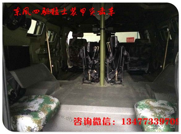 猛士裝甲內(nèi)飾:同樣受保密制度限制,沒(méi)有第一時(shí)間得到猛士裝甲版內(nèi)飾照片,與猛士基礎(chǔ)車型相仿,因?yàn)橹兄靡,車?nèi)中央通道前部被發(fā)動(dòng)機(jī)所占據(jù),后排座的中央通道形成一個(gè)平臺(tái),可放置貨品或?yàn)檐図斘淦骰咎峁┤藛T操作平臺(tái)。請(qǐng)注意上下兩幅圖的猛士裝甲版車門(mén)內(nèi)側(cè)特寫(xiě)的不同。