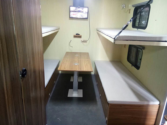 3、休息區(qū)備有4個(gè)上下鋪8個(gè)床位,配有床墊,每個(gè)上下床鋪依靠的墻壁上都有一個(gè)風(fēng)景透氣窗。每個(gè)床鋪下面設(shè)一組附件柜,床位兩側(cè)上方各配衣帽鉤、插座和可調(diào)節(jié)床頭燈,休息區(qū)配有19寸液晶電視一臺(tái)及空調(diào)一部。